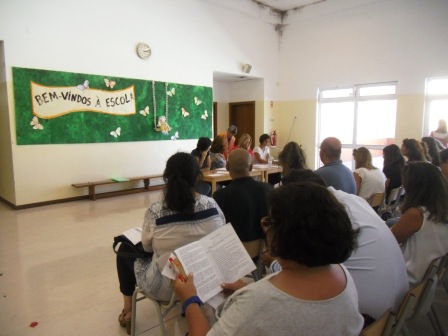 O espaço estava decorado com 3 painéis elaborados pelos três grupos de Jardim de Infância: desenhos de cada uma das crianças a ler um livro e todos em rodas dentadas articuladas: todos diferentes e cada um com o direito de ser como é.